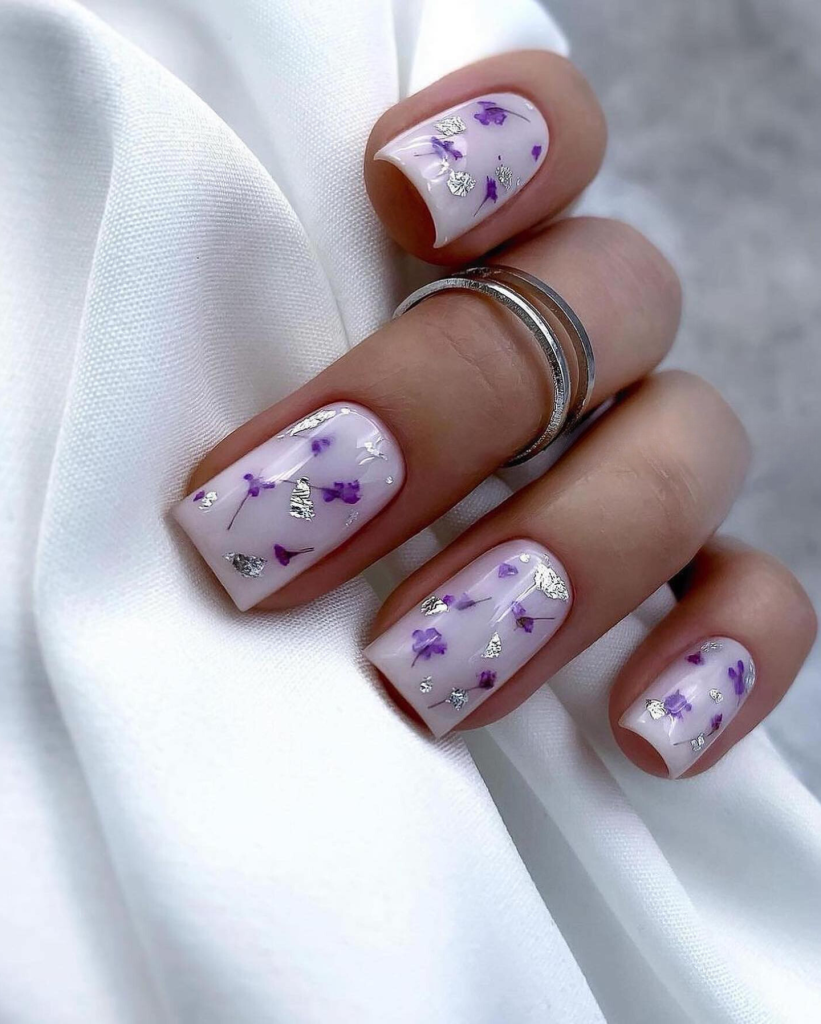 Lavender accent white and silver nails certainly exhibit a taste of class. The opacity of the face white and the silvery current of the glitter creates a posh and illustrious exterior while adding that touch of color with the lavender accent nail. This design is just for those searching for trendy and uncommon classy gel nails. The mixture of white, silver, and lavender makes these nails an ideal choice for a wedding.