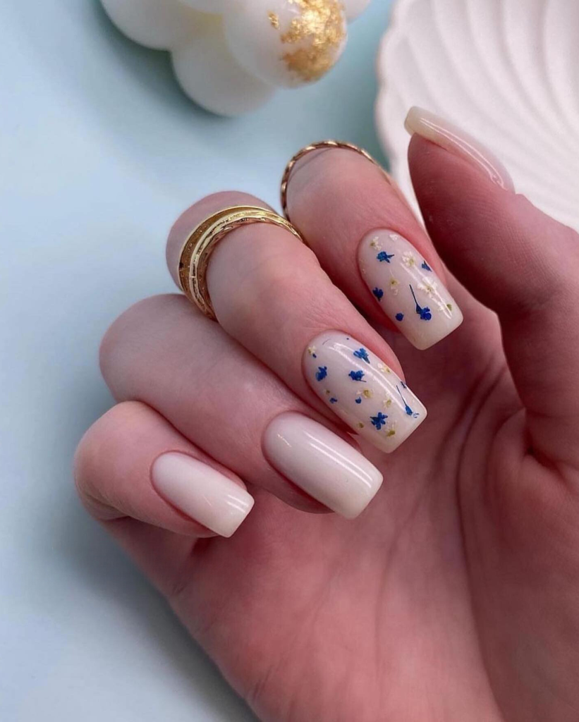 These chic nude nails with blue flower accents are a good option for a more neutral choice that at the same time is a pop of color. The nude base color is universal and can match any outfit easily, while the blue flowers bring in a touch of fun and style. This design is suitable for guests at the beach ceremony who want to have ideas that include blue and gel nails. The nude color gives an overall simple look while the delicate floral detail makes this a remarkable look for any wedding.