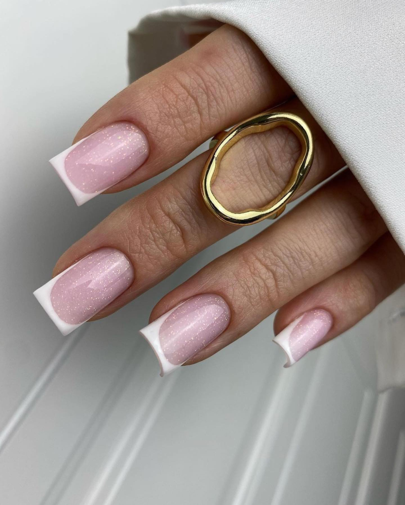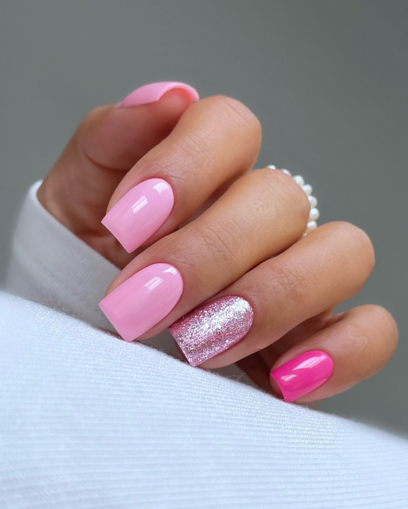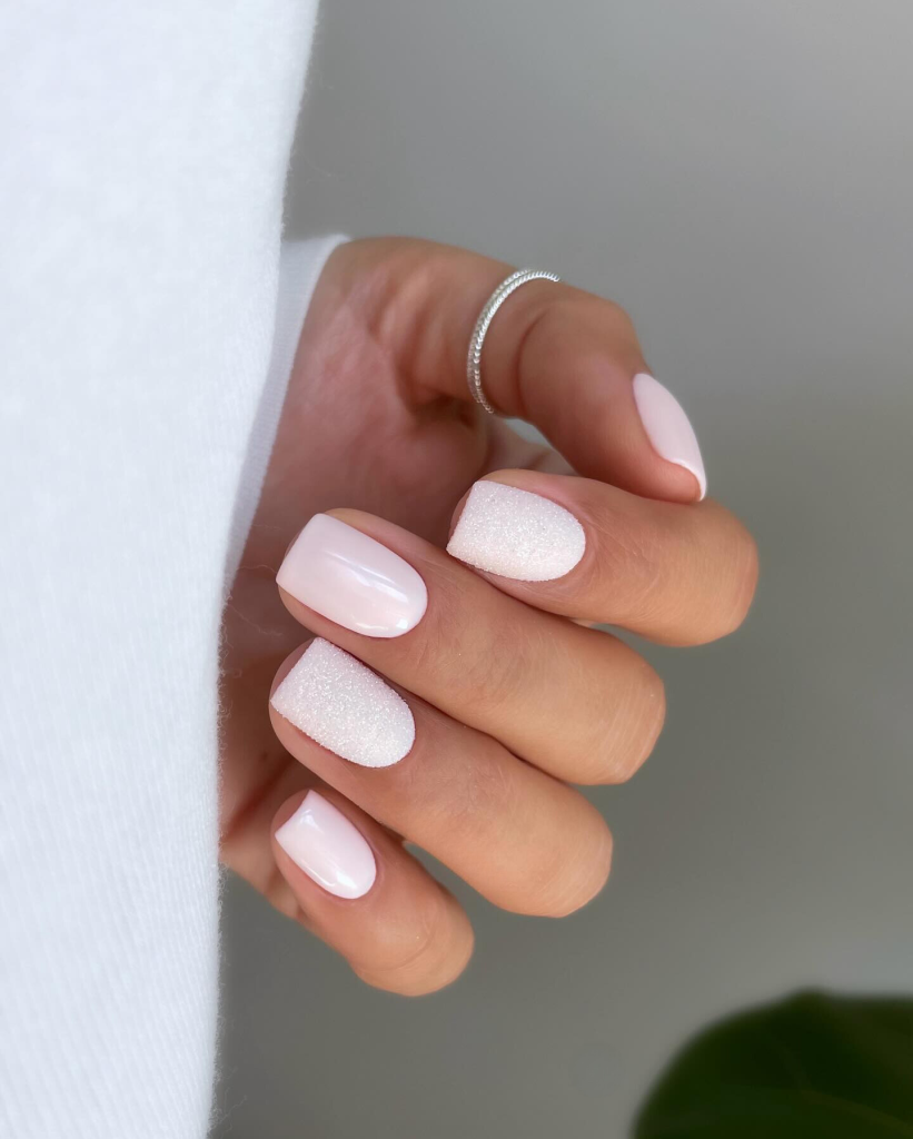 A pink base with glittery white tips is an innovative idea to the traditional french manicure. The barely visible sparkly elements add glamour to this design, making it a great option for people who are looking for both fashionable and classic ideas. Pink and glitter together give a chic and opulent appearance that is suitable for a wedding attendee.
