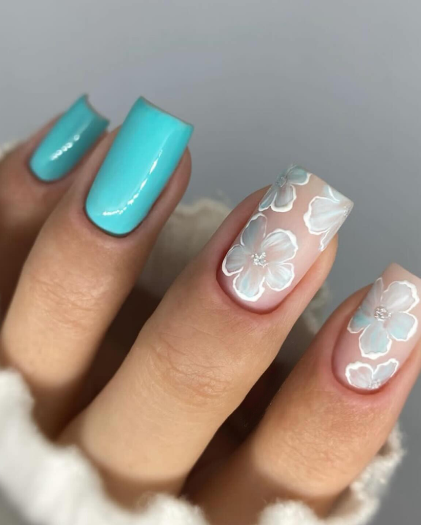 Pastel blue and pink floral nail art is the best choice for those who want a soft and romantic style. The light same-tone colors plus the delicate white flower designs are what you can choose this design if you are looking for a classy and sweet idea. The square form and the soft tones are just right for a spring or summer wedding when they make your outfit appear charming and elegant.