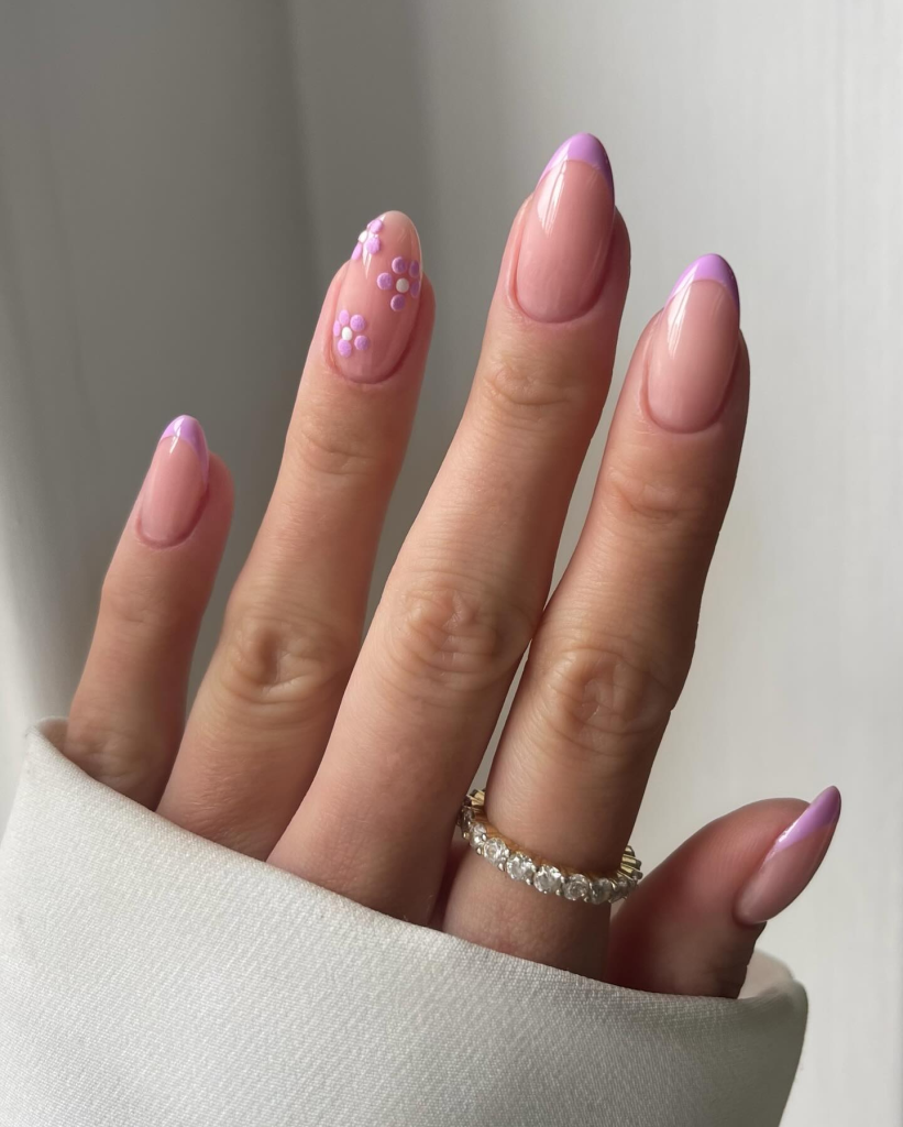 Style these nails in a fashionable way with extra lavender tips and cute little flowers. This nude base is nakedly brilliant and with the soft lavender tips and small flowers it completely fits the design for those who want to slay in a classy and twisted way. The almond shape and floral details are the perfect combination for a wedding guest who wants to be creative but still subtle with her look.