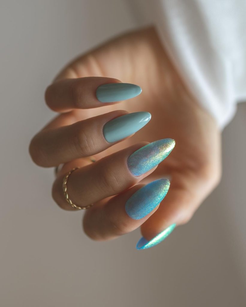 Absolutely, nails adornments with solid dope blue and one shiny holographic accent are truly irresistible for a person attending a wedding. Bright blue is extremely persuasive and chic, and the holographic effect is actually an optical illusion playing of light. This idea is suitable for people looking for something sophisticated and different at the same time. The juxtaposition of blue and holographic shimmer makes nails psychedelic enough for every wedding they are usually worn.