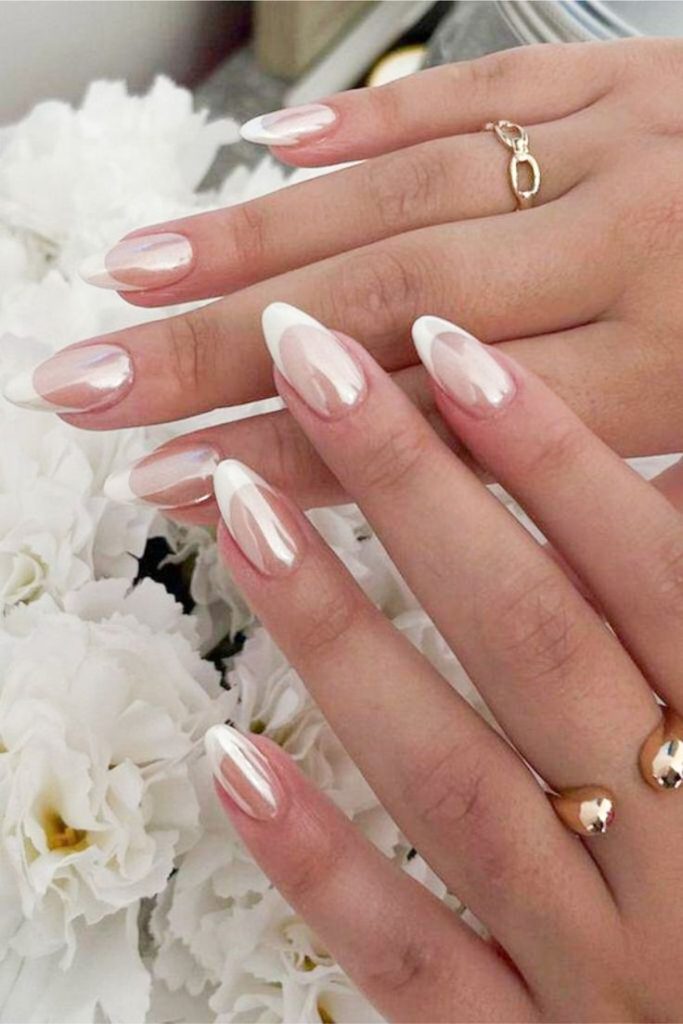 Almond-shaped designs are the latest trend in French manicures, which have always been in fashion. This combination of sharp white tips and nude base stands as an overview of the classic style that is both modern and timeless. This design is the perfect option for those who are looking for elegant nail ideas that can be paired with any outfit for wedding guests. The almond shape gives a feeling of refinement, hence these nails are a perfect selection for any white tie occasion.