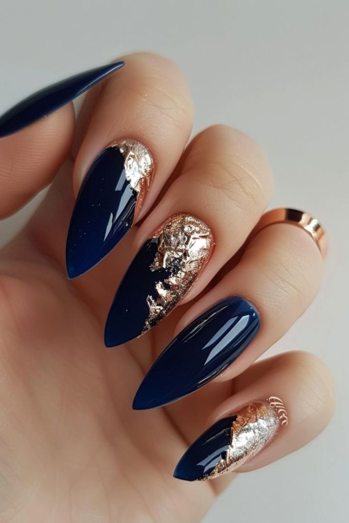 These stunning stiletto nails mix deep navy blue with striking gold foil embellishment, thereby creating a bold and attractive appearance. The deep and metallic hues are sufficient to make these nails your choice for a black-tie wedding or an evening party. This design is ideal for those guests looking for an idea for a formal event, where expressive but classy nails can raise the whole outfit to a new level. The blue color is a right choice for incorporating a modern twist in a traditional style.