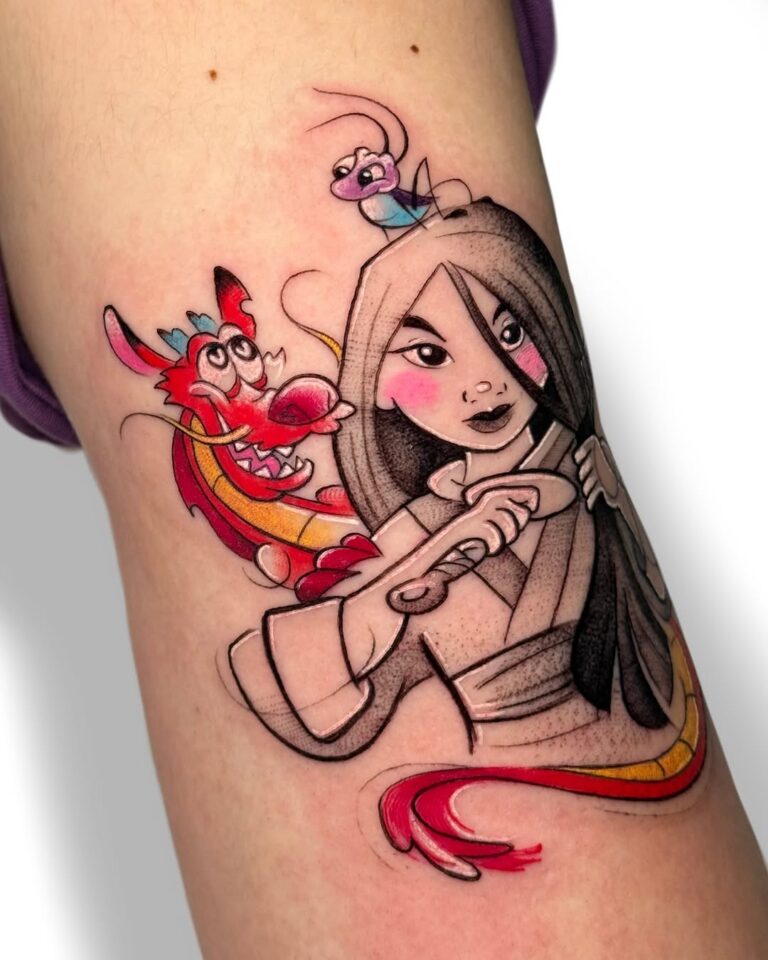 This vibrant tattoo features Mulan holding her sword, accompanied by the playful Mushu and the curious cricket. The colors pop with a fusion of adventure and spirit, representing bravery and friendship. It’s a perfect homage to a beloved Disney classic, ideal for fans embracing their inner warrior.