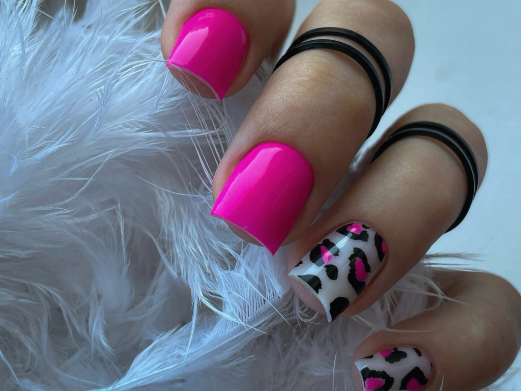 24. Neon Pink Cow Print Nails