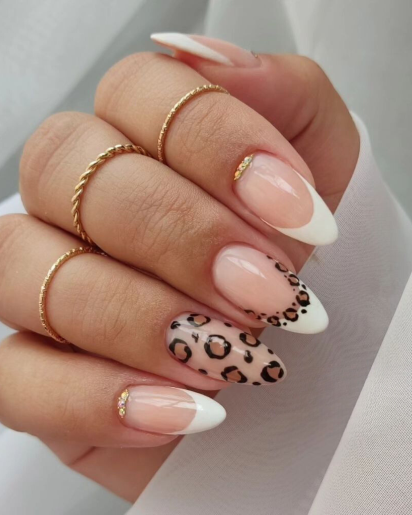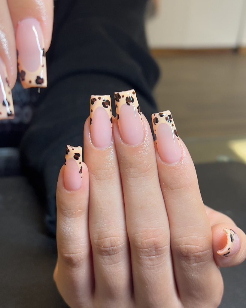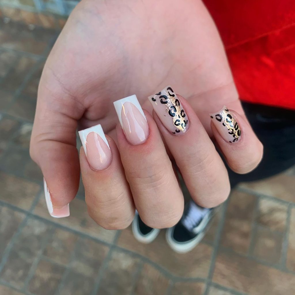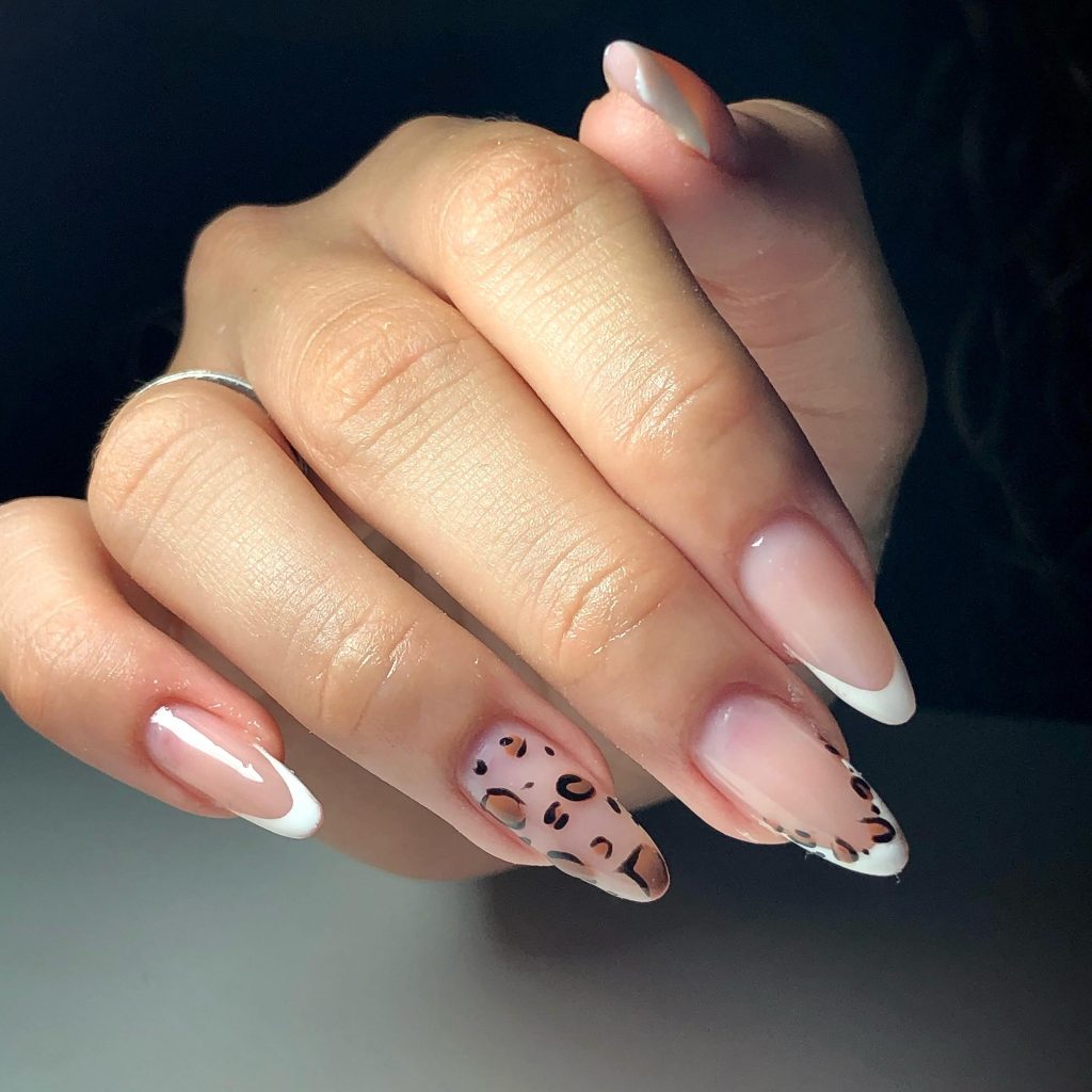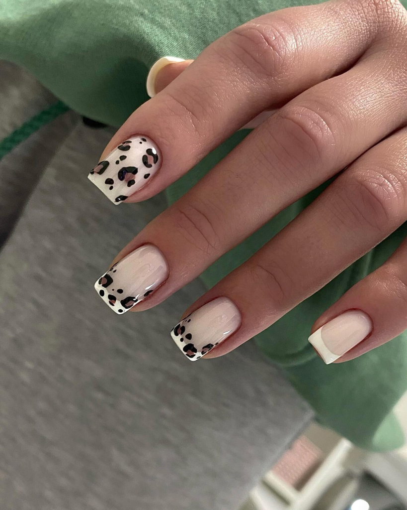 These stylish nails blend the traditional French manicure with a contemporary leopard-print detail. The nude base features white edges and discreet leopard spots, which renders the look both chic and modern. This French design is suitable for casual wear as well as for special events.