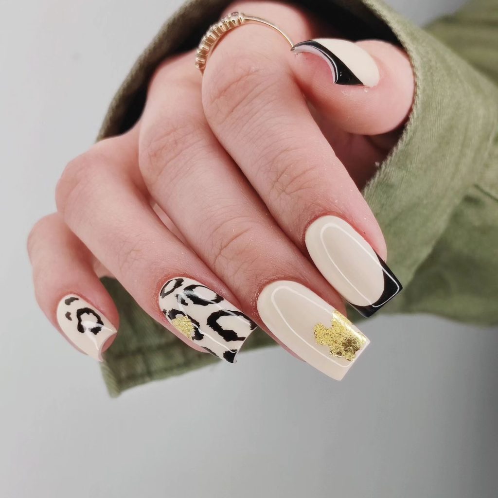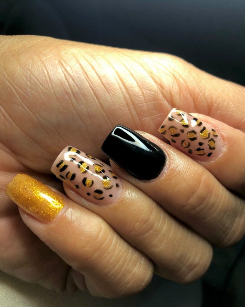 These black and gold leopard nails have luxury written all over them. The combination of black and gold with leopard spots in the design appears to be highly sophisticated and attractive. For the evening or the dressing for a special occasion, this design is perfect for the nails, adding a little touch of luxury.