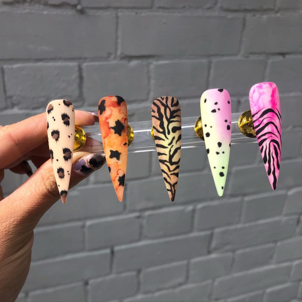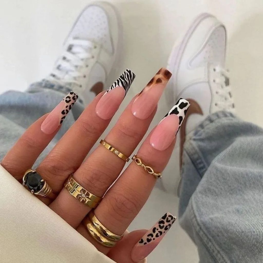 The design displays a mix of zebra, cheetah, and cow prints by the combination of various animal prints on each nail. These sharp nails are the perfect place to flaunt the cool and intricate patterns and, therefore, create an utterly distinctive and wild look. People who are fonder of contrasting art designs that are well placed and wish to crown their fashion with a touch of it are the ones entitled to wear this style.