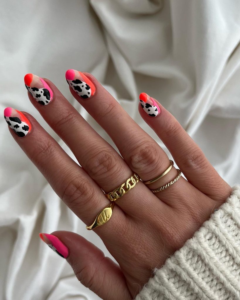 Uniquely fusing the features of both animal styles, it has a cow print with a colorful leopard. The neon pink and orange accents make the animal prints stand out, so the simple touch of art to the manicure looks very funny and playful. This design is suitable for those who are fond of artsy designs and who aim to color their nails in a vivid way.