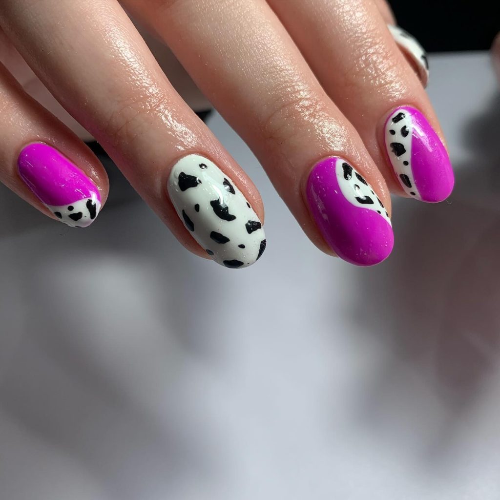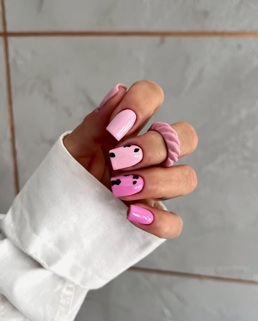 The pink cow print nails, besides being cute, have a bright pink base and black cow spots. The duo of pink and black is the way to go for a fun and different summer design. The idea is perfect for those who are into neon colors and want to rock a different style in their nails.
