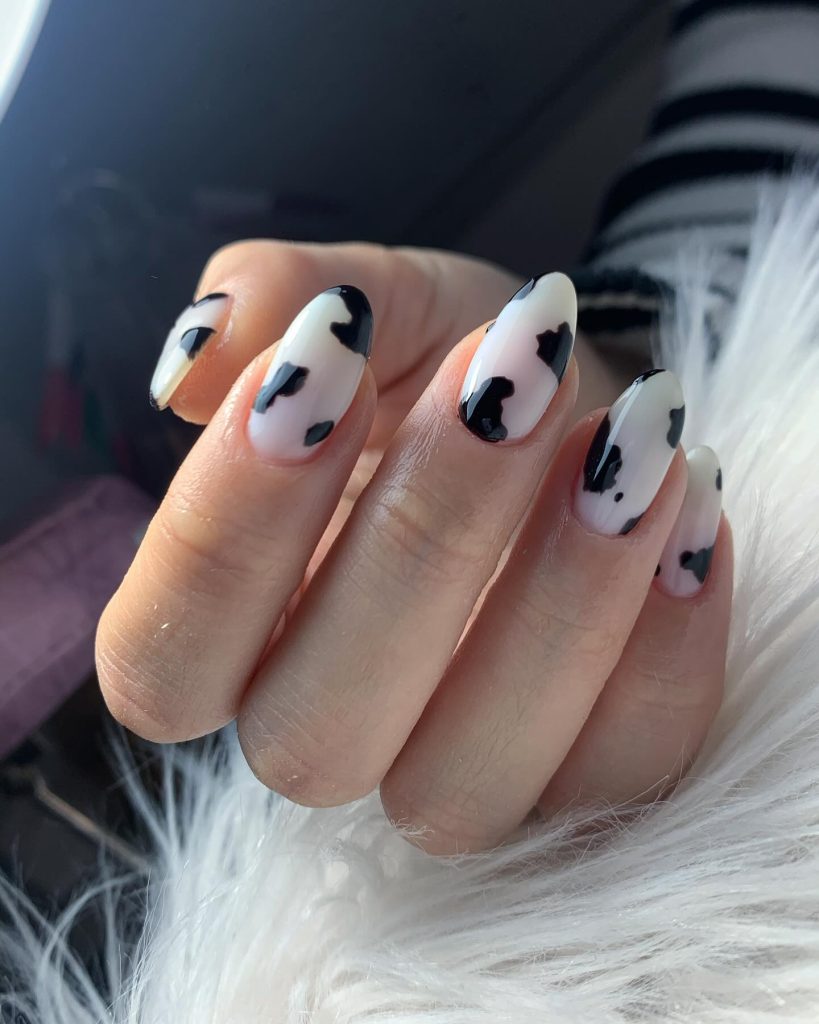For minimalists, these cow print nails are a grThese cow print nails are a great option. White nails with black cow spots make the nails appear clean and modern. This design is the ideal choice for people who appreciate a sleek yet fashionable way of wearing animal print nails.