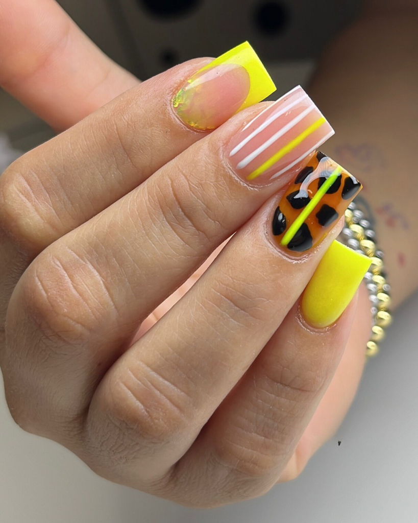 These neon striped and leopard nails are a must-try for the ones who love bright colors. Printed with a combination of neon yellow, stripes, and leopard spots, this design oozes fun and excellently represents the summer season. The juxtaposition of patterns and colors renders this neon design perfect for summer and accessorizing your look with a splash of radiant tints.