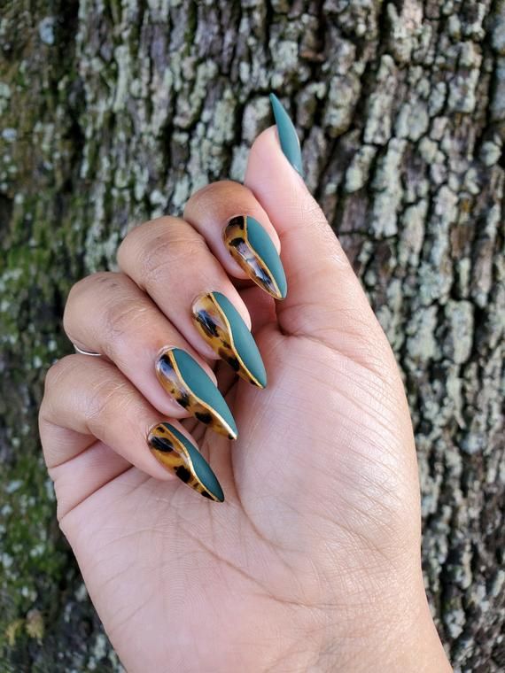 Tortoiseshell and deep green nails are not just a classic animal print but also a creative, modern way to illustrate the chic style of these nails. The natural-looking pattern and the bright-colored green merge into a lively picture that is at the same time powerful and harmonious. The almond shape of the nails adds more length to the design and, thus, gives a more sophisticated and balanced look to it. The use of neutral tones together with vibrant greens makes this look ideal for fashionistas who want to be trendy yet elegant at the same time. You can match these nails not only with outfits that are inspired by fall but also with the ones made of earth-colored materials for an outlook that is entirely you.