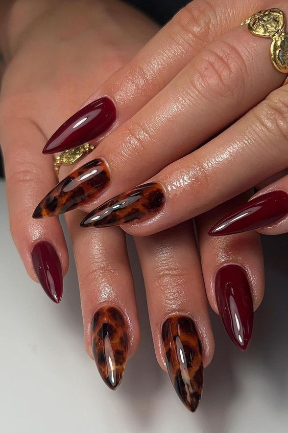 This showy style combines the traditional tortoiseshell model with vivid red nails, resulting in a stunning and luxurious finish. The pointed stiletto shape emphasizes the fearlessness of the design, thus creating a fierce and confident style. The high-gloss finish is an extra touch to the overall glamour, making these nails an excellent choice for a special event or where you want to stand out. The contrast of the colors, the red with tortoiseshell, is what adds the visual interest and gives the outfit a bit of the fall season. These animal print nails are what you need to prove that classic style can be transformed through experiments with textures and colors.