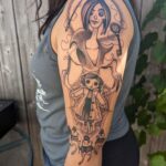 This tattoo features two delicate hands below a crescent moon, evoking a sense of mystique and elegance. The intricate details and soft lines add a feminine touch, making it an ideal choice for those who feel connected to lunar symbolism. It’s a striking way to express spirituality and femininity through body art.