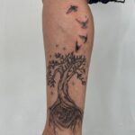 This tattoo features a beautifully detailed dagger entwined with vibrant flowers. The contrast of the sharp blade against the softness of the blooms creates a striking visual effect. It’s perfect for someone who appreciates a mix of strength and beauty in their body art.