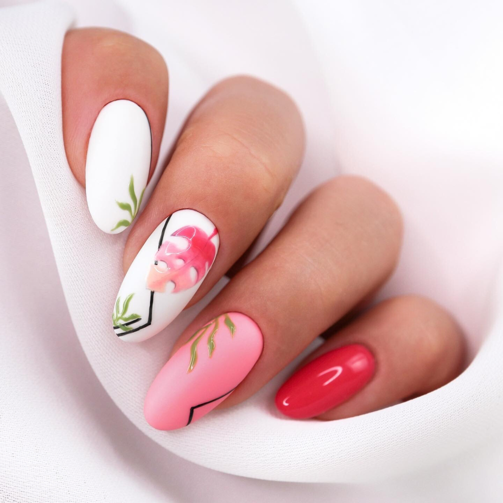 Getting your toes in the sand has never been so stylish with your nails in the tropical sunset era red pink color. The nails show off a beautiful cauliflower from coupor to offmatically tip. The decorated way of a finger is a masterpiece of palm trees which is a special attribute of summer trips. This motif is for those who enjoy summer’s heat and color, particularly with tanned skin, and it also mirrors the joy of the beach party.
