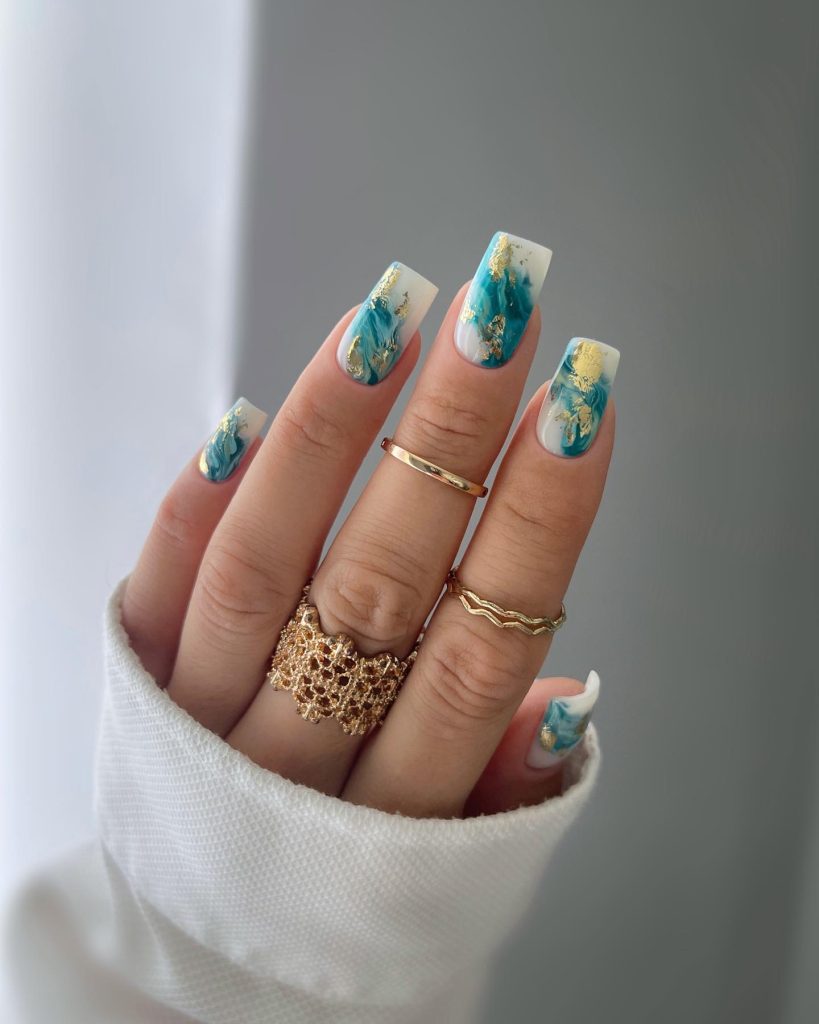 As if mirroring the ocean depths, these elegant almond nails carry the mysteries of the sea to your fingertips. Twisted turquoise and gold foil create an abstract illustration of waves and sand beaches. Pearl with metal gold ring makes the nail design a treasure chest of ideas for the upscale beach visitor. This particular design goes very well with breezy linen dresses and golden-hour beach photos, which are perfect for those who get inspired by the sea’s perpetual dance.