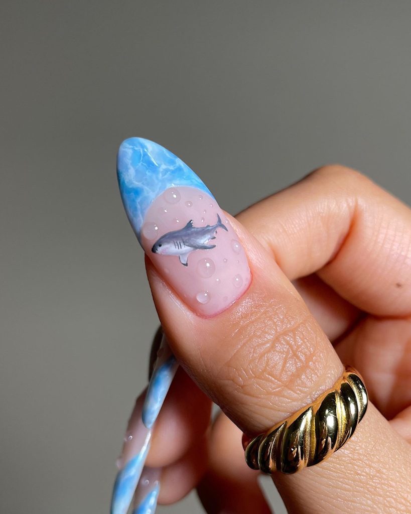 Take a deep dive into marine adventure with nails that tell a story. Here, a playful shark motif swims across a backdrop of bubbly pink and clear water blue, creating a narrative of underwater encounters. This nail art is a conversation starter, an ideal choice for those with a penchant for storytelling and a love of the aquatic world. They’re an apt choice for natural nails, expressing a love for the ocean’s inhabitants while vacationing by the sea.