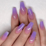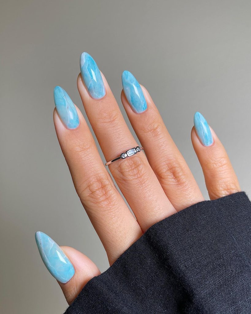 These acrylic nails perfectly portray the image of a tranquil sky beautifully reflected on the water. The ombre from clear to sky blue, full of white dots, resembles the peaceful morning of a beach. The square shape not only is a classic, but also it is a modern twist and this is ideal for those who like simplicity but with a twist. A loose sarong or a casual maxi dress is the best combination with these nails to show the free spirit of a beach goddess.