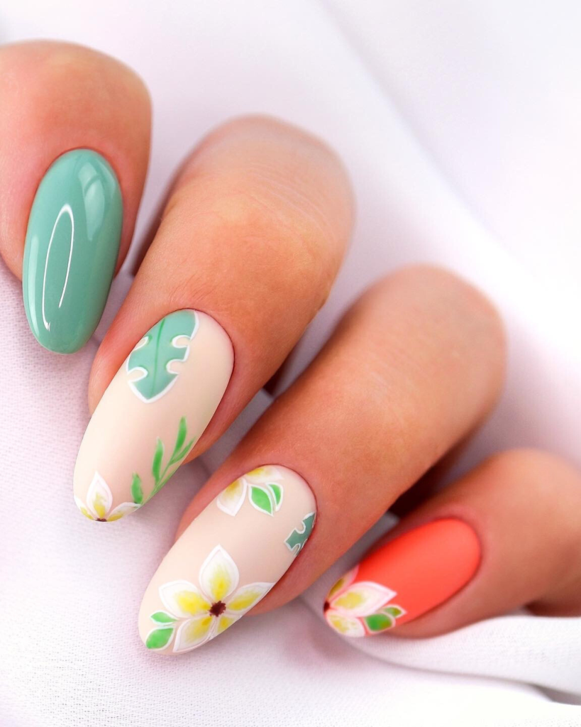 Nails that showcase lovely flowers blossoming are a perfect blend of the spring season and the summer joy. The lighter hues of green and coral that are less luminous serve as a gateway to the cheerful hippie walks on the beach, thus giving rise to the memories. The circular-shaped nail design is much like nature, which is a color bachelor and is an outfit that adds to the beach bohemian style.