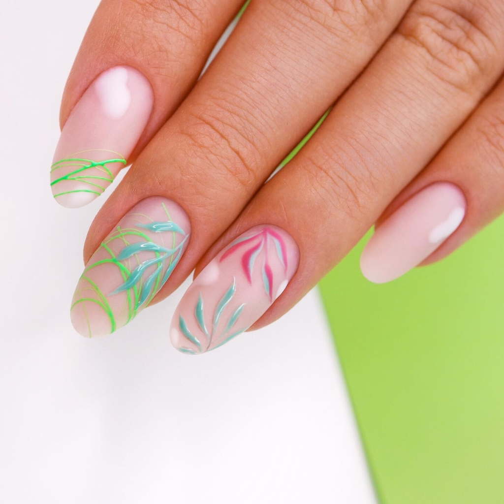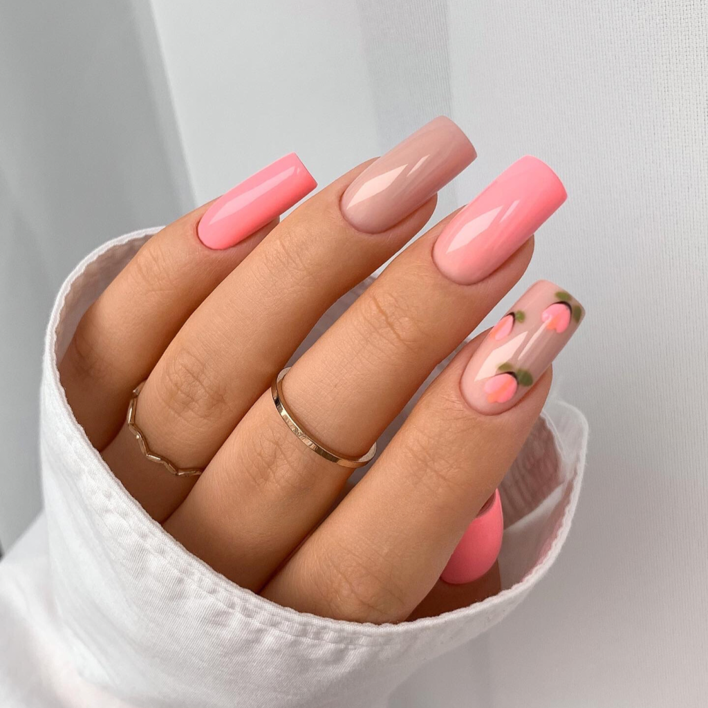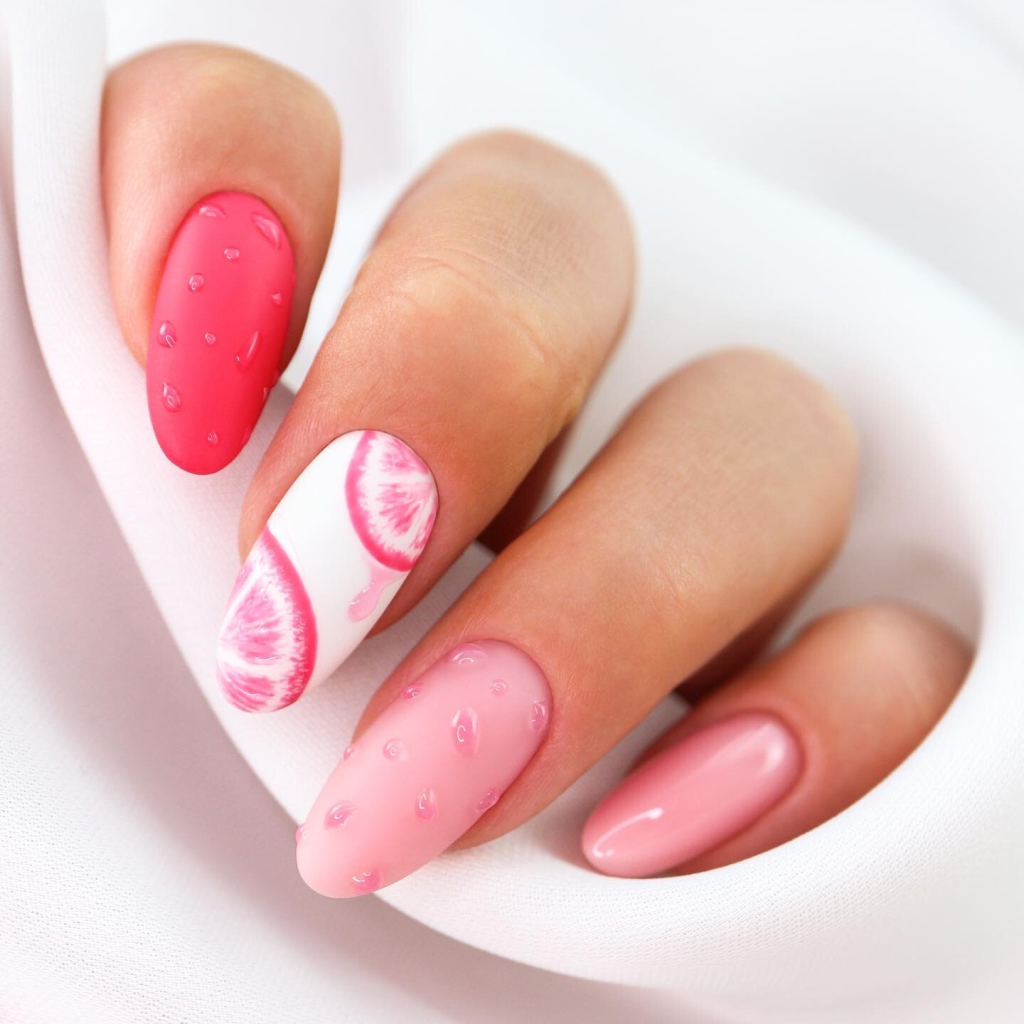 Pastel pink and strawberry designs are the nails of those who are the simplest and sweetest lovers of life. The round-shaped, gel nails are decked out with beads that resemble a cocktail of tropical fruits on a hot summer day at the seaside. For a relaxed day having fun in the sand and picnicking on the shore, they are the perfect companions.