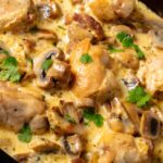 With the pan still over the heat, pour in a small splash of beef stock (or water or wine) to deglaze. Scrape the bottom of the pan with a wooden spoon to release all the caramelized brown bits stuck there—this is packed with flavour. Pour this liquid, along with the scraped-up bits, into the slow cooker over the seared meat.