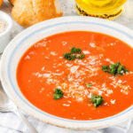 Let the soup cool slightly before blending. Fill your blender only halfway, keep one corner of the lid open to let steam escape, and cover it with a towel to avoid splashes.