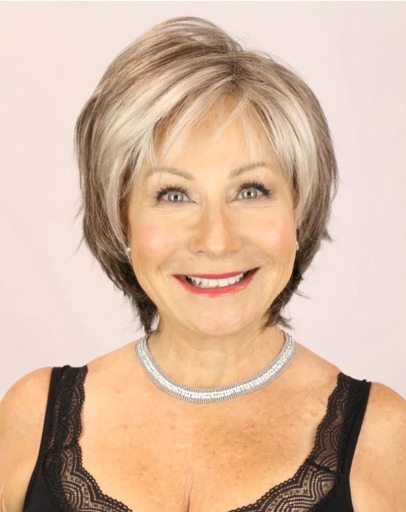 This hairstyle, possessing the expertly cut layers, is the most highly volumized and fanciful, mainly for people with fine hair. The cool-blond pieces which brighten the face and the style remain low-maintenance show the great beauty of short layered haircuts for women over 50.