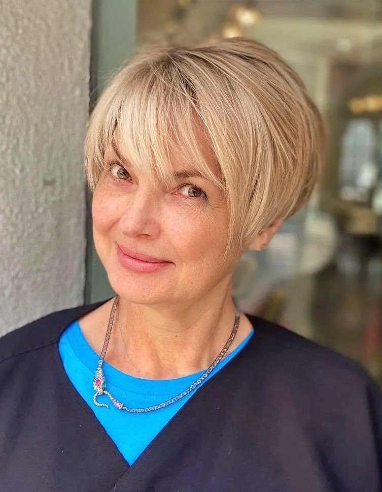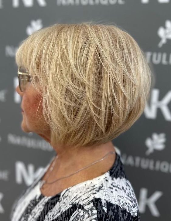 A short layered haircut not only looks stylish but is also very convenient for women over 50, which is why it is one of the best choices. The addition of the layers brings in the texture and the volume, which are the key factors for the fine hair. The nape part is close to the head and the rest gradually becomes longer up to the crown, where teasing is done for more height. This option is truly for those who prefer short hair that still is a little playful. The warm blonde shades give a warm color to the complexion and in this way, the look can be fresh and bright. To make this hairstyle you need a bit of mousse and a round brush that will be used to lift the hair at the roots when you blow-dry.