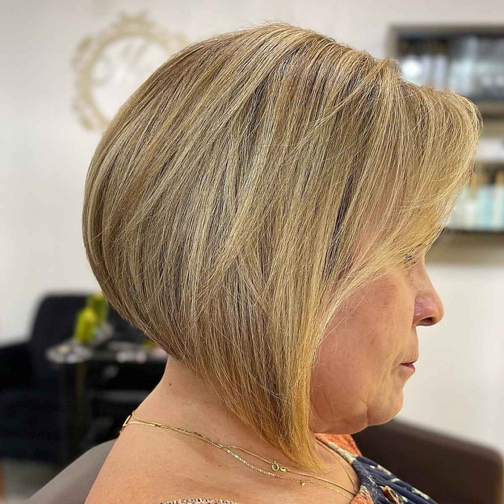 The stacked bob haircut is a classic option that is very suitable for round faces, especially for people over 50. The back of the haircut is complete with graduated layers that increase the volume and lift, thus, the face looks longer and you look more youthful and modern. The delicate layers throughout the haircut make it light and it won’t seem too heavy at all, that’s why it will be a great choice for the fine-haired women. The honey blonde highlights add beauty to the texture and make the hairstyle appear 3D and movable. Besides getting regular trims, you would need to use a lightweight volumizing mousse to keep the hair lifted at the roots.