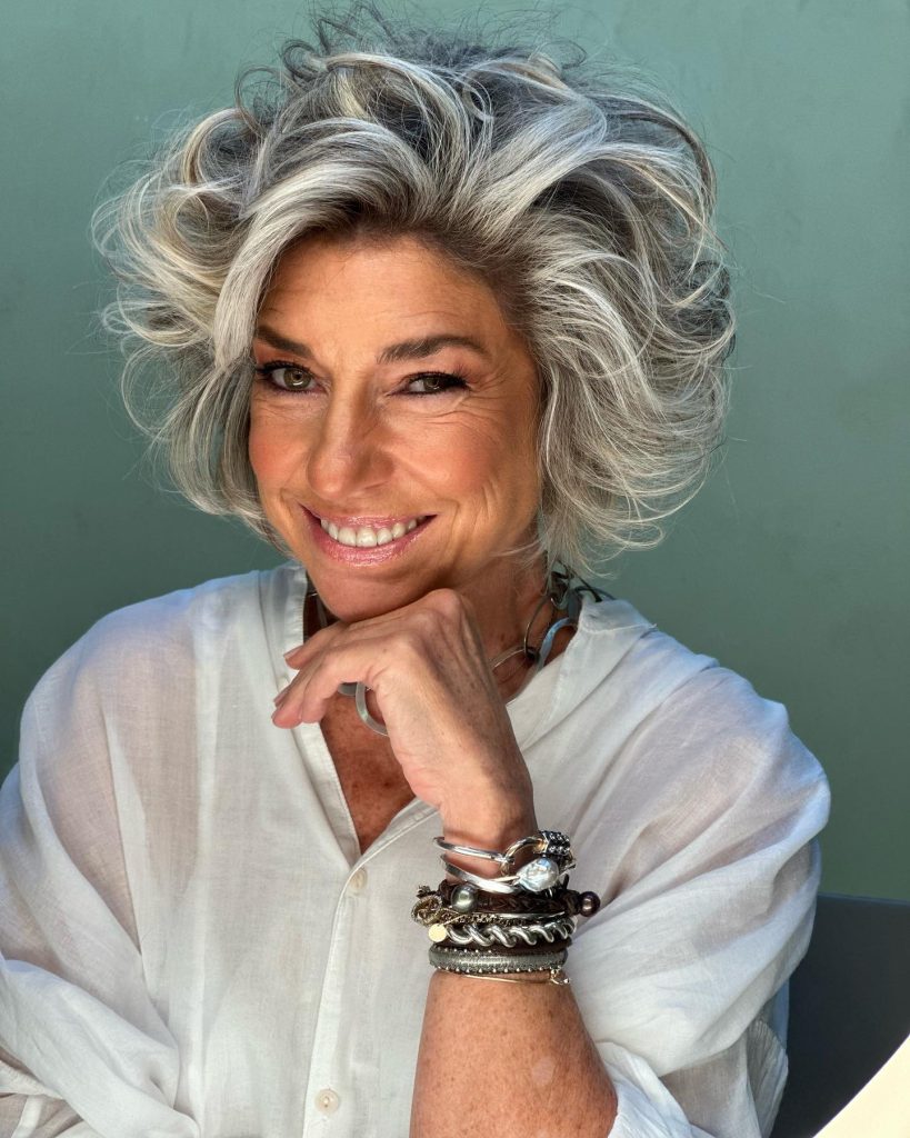 The hairdo illustrated here is all about resurrecting the curls and highlighting the natural grey tones. The medium wavy hairs are styled in such a way that they bring forth the curls’ bouncy and textural quality, making a style that is both classically chic and youthful. This is a hair inspiration for the girl who wants to rock her full-bodied hair and exuberant nature. It is a good phrase that means fun and grace can walk together.