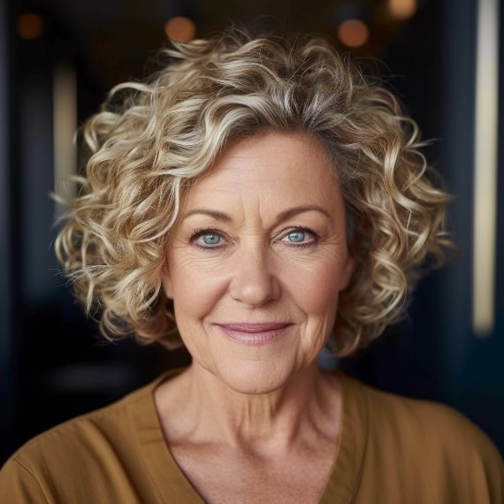 The hairstyle presented here is focused on volume and vitality. The medium 2024 hairstyle for women over 60 is not afraid of body and bounce. These big, gentle curls radiate a youthful charm and demonstrate that thick hair can be arranged in both elegant and amusing ways. The side-swept bangs add a playful aspect to the general style, while the highlights of golden tones in the hair give warmth and depth.