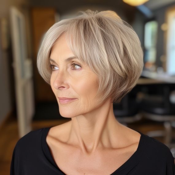 A short bob with feathered bangs is a super sharp and stylish choice for women over 60. The cut is able to accomplish a perfect combination of softness and structure, thus it is very good for framing the face perfectly to highlight the bone structure while it also gives dimension to fine hair. The barely visible layers at the borders provide a fuller look, and the bangs add a fun but elegant note to it, thus it is the perfect model of the short hair in 2025. Women who are looking for a professional and everyday look that changes from day to evening easily would find it to be wonderful.