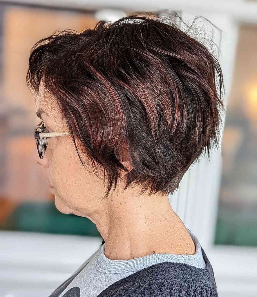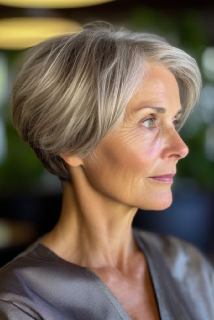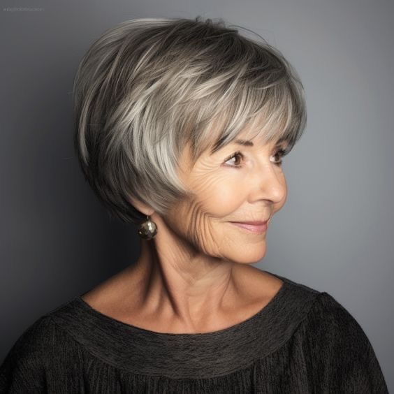 This hairstyle radiates a chic and sleek aura, perfect for the modern woman over 60 who’s all about sophistication. The layers are cut with precision to provide texture and movement, giving a short but full-bodied look. The silver and black hues blend seamlessly, adding depth and dimension to the style. This cut is easy care, making it a go-to for women who desire elegance without the fuss.