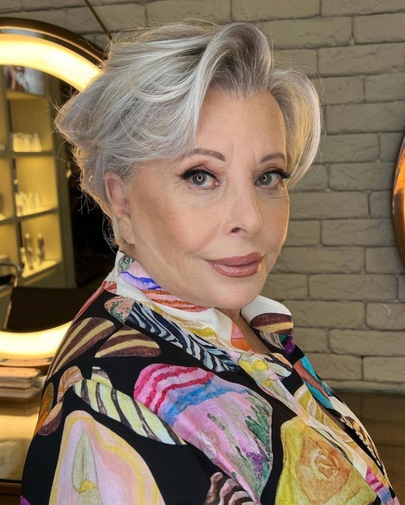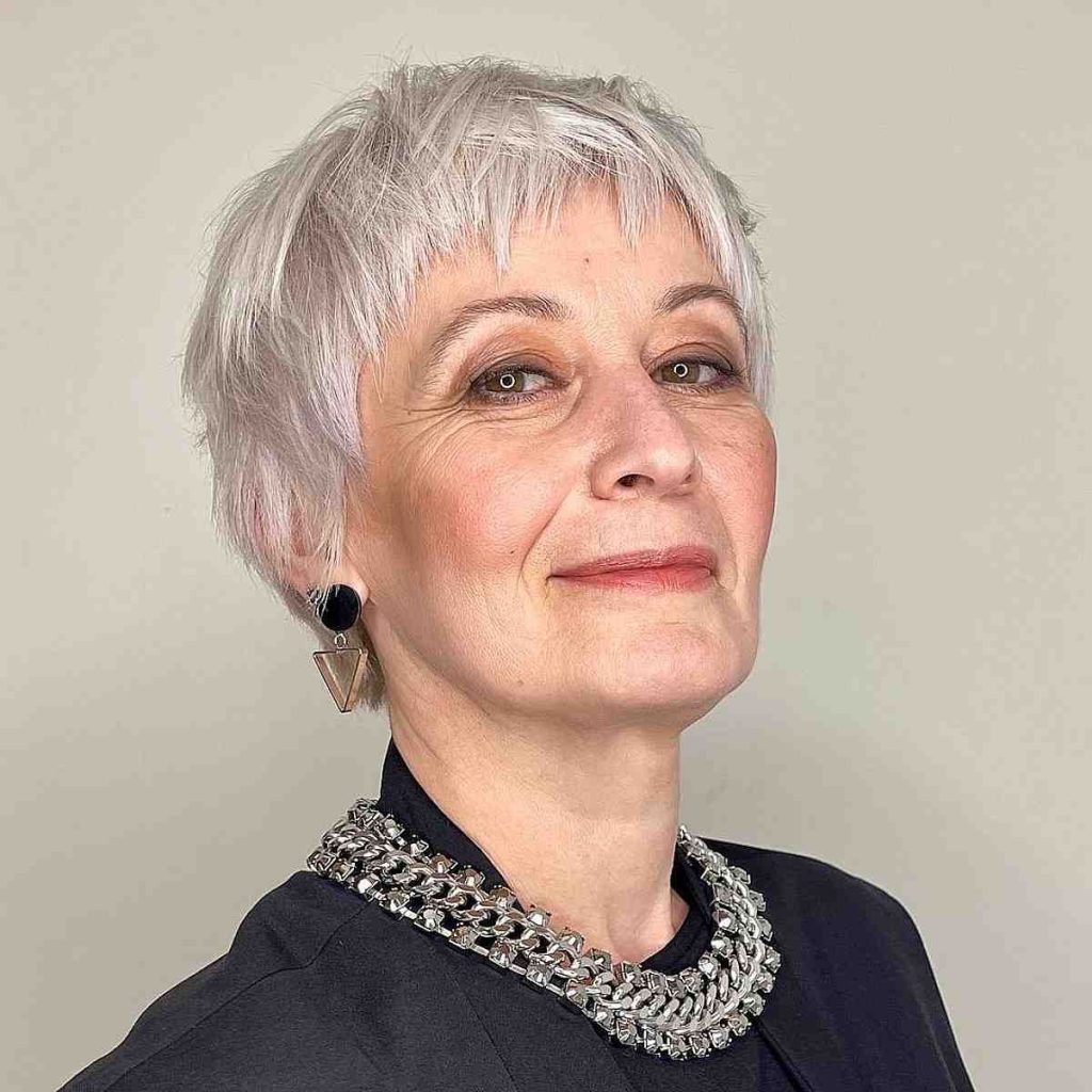 In this image, the pixie cut is joyful yet modest, which is perfect for a woman who walks through the years with dignity and happiness. The short pixie cut with bangs is still sharp and youthfully innocent at the same time, which is the first thing that comes to mind after look, highlighting the wearer’s cheekbones and eyes. The white blonde color is a modern addition to the cut; in addition, the layers create texture that can be styled with ease and is just”IT”. It’s a radical option for those who want to be different and accept a short hairstyle that is full of spirit.