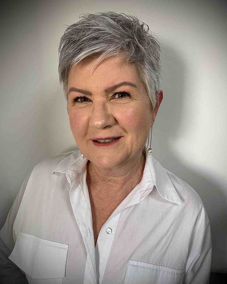 This pixie cut depicted in the photo is a strong and lovely statement of a contemporary woman, who prefers a striking hairstyle with a minimalist twist. The short cut is ingeniously layered to create volume at the top, while the sides are left trim and neat. The natural gray hair is embraced, demonstrating the wearer’s self-acceptance of her beauty without any artificial enhancement. It’s not only a cute pixie but it’s also very chic and timeless.