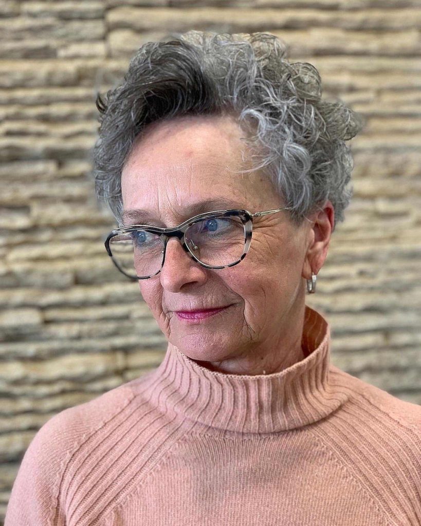 A modern interpretation of the timeless pixie cut is shown in this image, which is longer and more daring. A medium wavy texture is added to the short pixie style that softens and modernizes the look. The gray shades are a reminder of the natural aging process, while the styling indicates that the woman is trendy and in fashion.