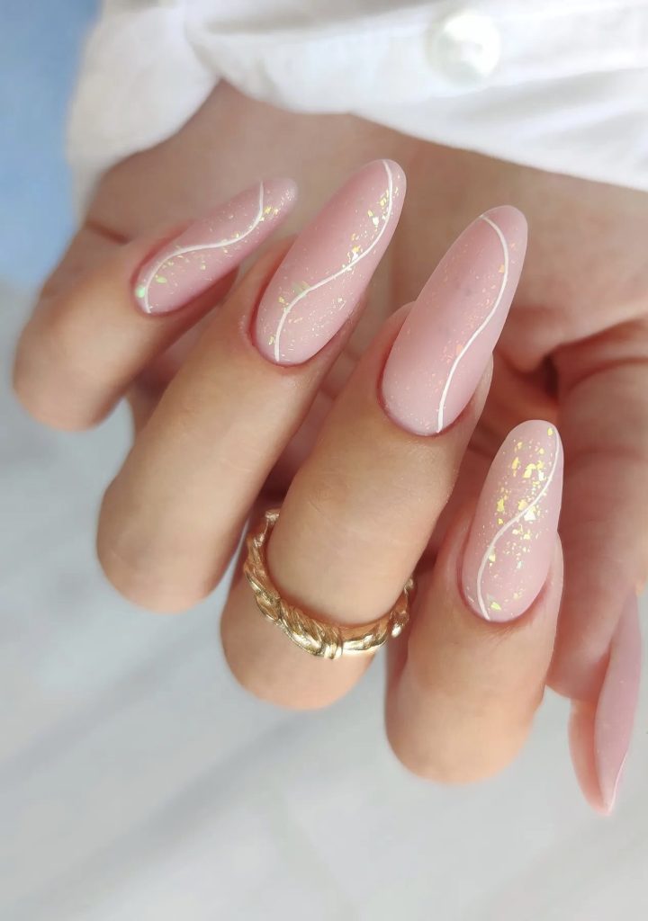 For an exotic touch, opt for the sandy pink nails with the golden glitter, which are similar to the sunlit dunes at dusk. They will be the ideal addition to a romantic walk by the shore at night.