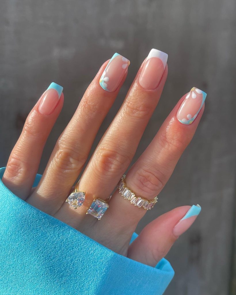 Do not leave the outfit with a plain look, you can use cheerful yellow tips with a light pink base that is decorated with small white daisies, and make it outstanding. A leisure day out with friends or the family is made better by this flamboyant design.
