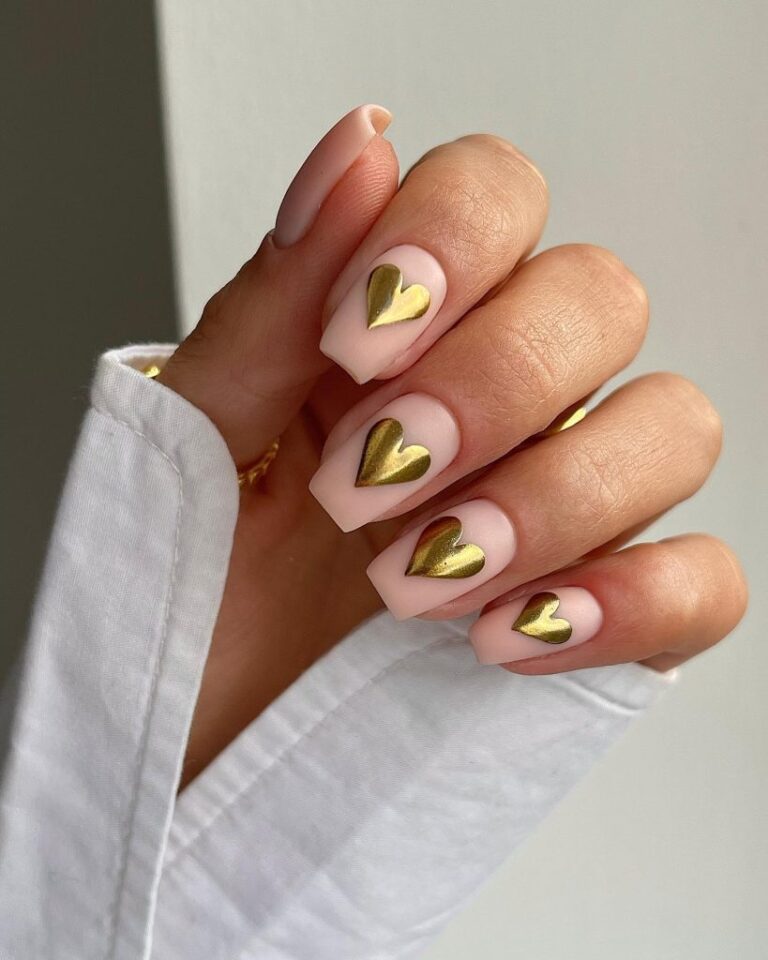 Soft pink nail polish embellished with glitter and tiny heart stickers looks so traditional and even romantic. They are the best choice to complement your sweet and delicate style for a dinner date.