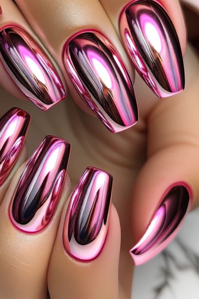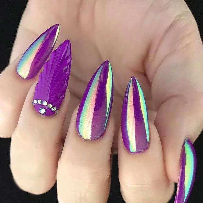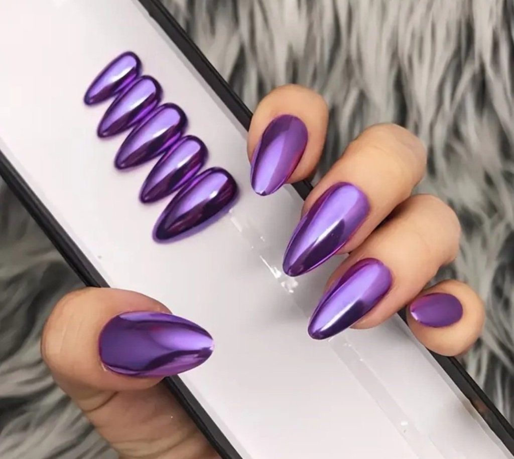 Our following sight is for those who are bold enough. These nails are an exclusive mixture of purple chrome’s sleekness and the edge of a perceived metallic sheen that resembles a straight futuristic form that is definitely the boldest and unrepentant. This is the kind of trend that says you have confidence, made for the trendy first of fashion.