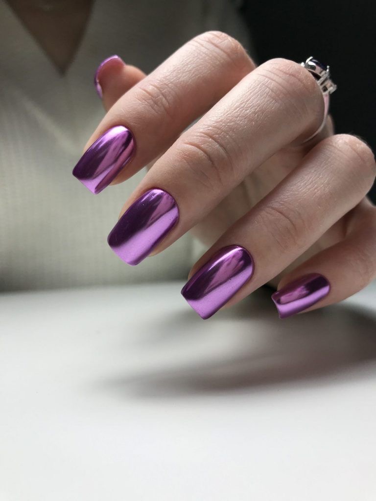 With a reflective purple chrome that catches every glint of light, these nails are for the bold at heart. The square shape is a nod to classic designs, while the brilliant sheen adds a modern twist. It’s a design that commands attention and conveys a confident spirit.