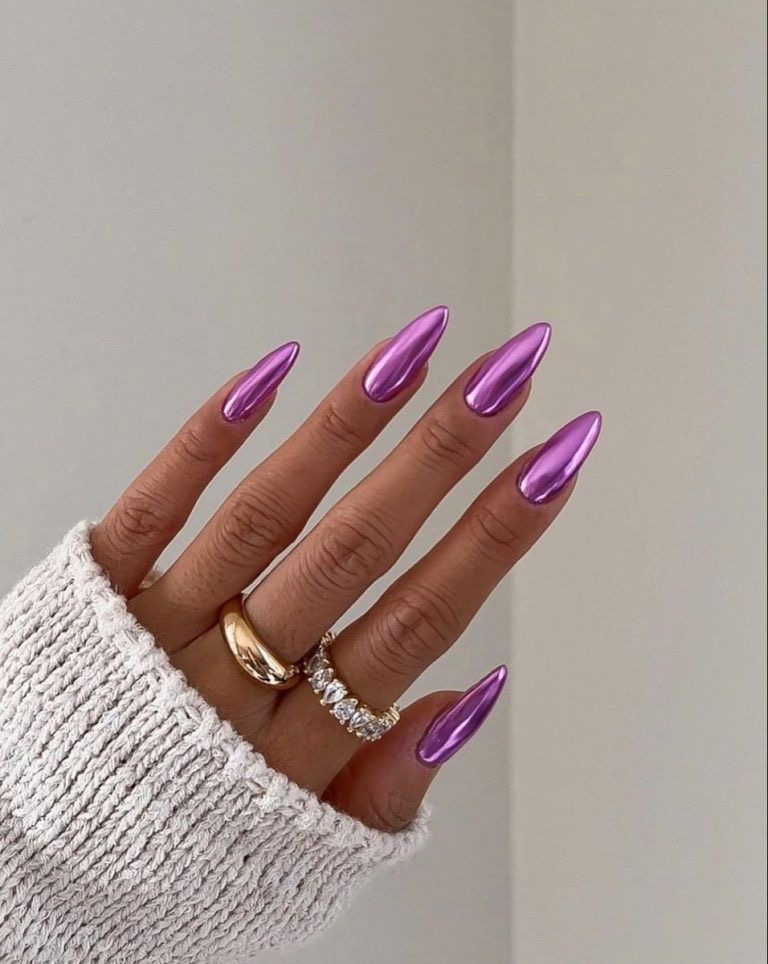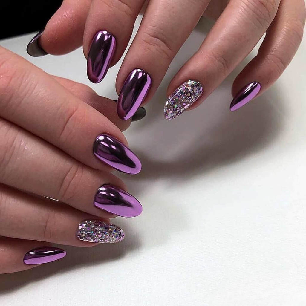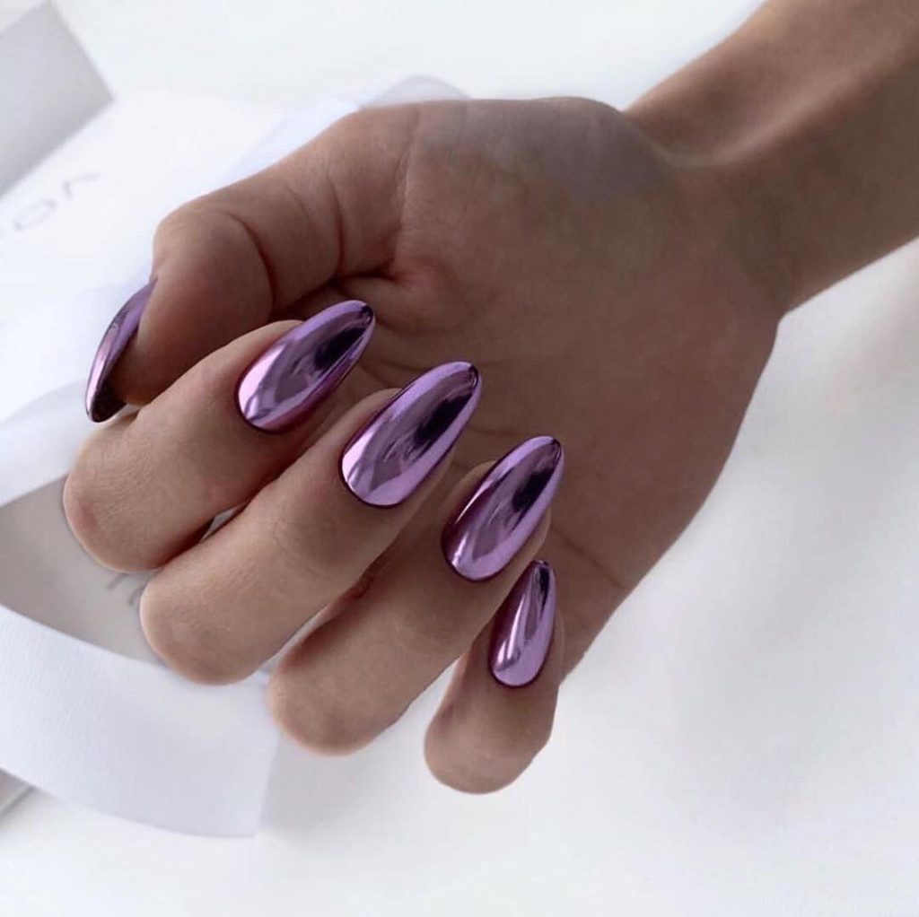 The dark purple chrome color derived from these nails is a perfect addition for the fall and winter seasons. The combination of the darker shade and the chrome finish delivers a dark, striking, but still classy and refined feeling to the nails. The almond shape is smart, which is why this model is suitable for everyday wear and also for important events. You can wear these nails with autumn clothing, such as a leather jacket or dark colors that stand out, for a trendy and coordinated look.