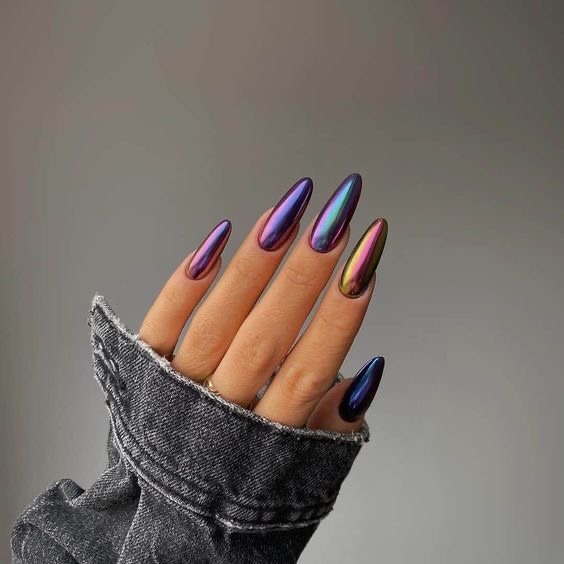 The prismatic effect of these nails captures the essence of purple chrome with colors shifting from green to blue and back to purple. This is a design for those who appreciate the interaction of light with color, making it a dynamic look that is ever-changing and always engaging. It is a new wave way of doing nails which is expected to become highly popular in 2024.