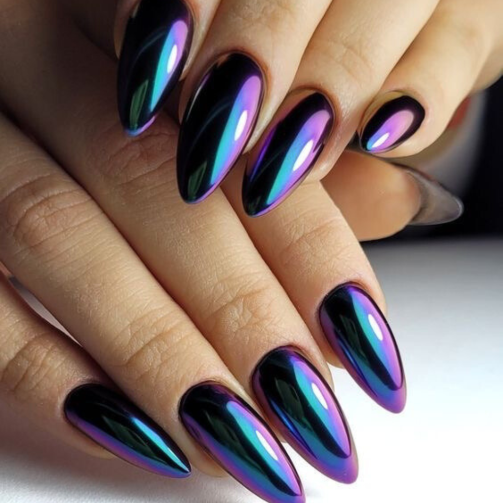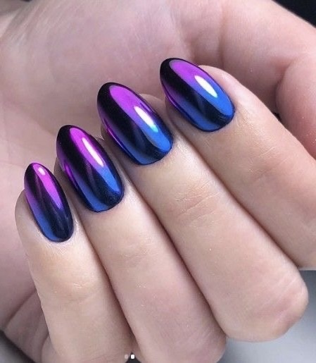 Just like casual denim days, these nails are a perfect match. Their dark base with a purple chrome finish reflecting the kaleidoscope of blue and pink hues is truly eye-catching. Thanks to their almond shape, the nails are both modern and attractive looking, which is just right for lazy weekends or a night out with friends.