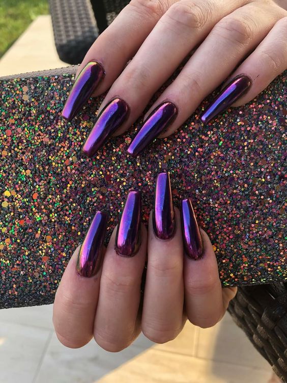 In this sporty design, coffin-shaped nails are paired with a bright purple chrome finish for a forward fashion huge. The coffin cut is a cutting-edge design that is perfect for women who are passionate about the bold and long nails. The contrast of chrome neatly defines the coffin nails’ shapes, thus they are a perfect choice not just for fashion shows but also for partying. You could also think about using rhinestones or simply adding art to the design if you want to give it a plus.