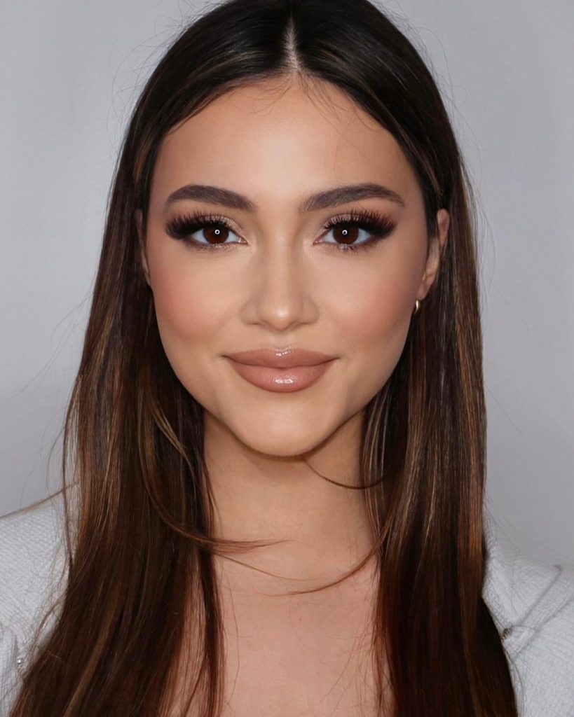 This makeup style is the epitome of polished glamour, ideal for brown eyes that want to shine without dramatic color. The luxurious lashes are the focal point, complementing the shimmering eyeshadow that adds depth and dimension. The glowy skin and the perfectly paired nude lip make this look a stunning choice for a wedding or any high-end event where cute and pretty are the dress code.