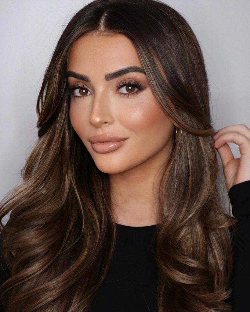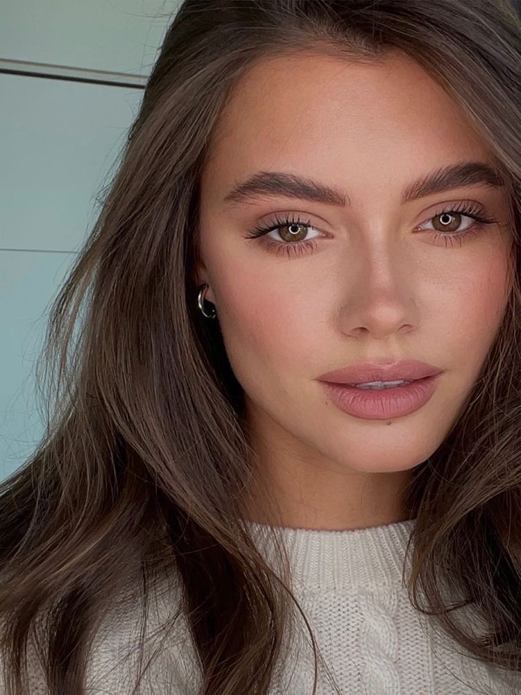 This look captures the essence of urban chic with a modern twist on natural makeup looks. The neutral eyeshadow palette is elevated by bold mascara, giving depth to the brown eyes. Paired with a soft lip color and a structured, fashion-forward outfit, it’s an ideal style for the city-dweller on the go.